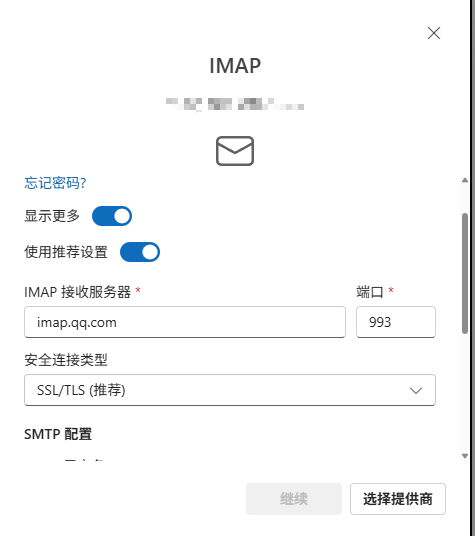 接收邮件服务器: imap.qq.com,使用SSL,端口号993